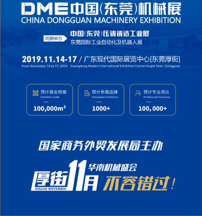 在當(dāng)前“中國(guó)制造”邁向“中國(guó)智造”的關(guān)鍵時(shí)期,展覽業(yè)也在不斷助力智造升級(jí)。2019全新 DME中國(guó)東莞機(jī)械展將于11月14-17日在東莞厚街·廣東現(xiàn)代國(guó)際展覽中心舉辦。